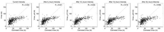 Correlation coefficients between estimated Vmaxand best-track Vmax and their scatter plots. The correlation coefficient of the estimated 0-h, future 6-h, 12-h, 18-h, 24-h Vmax, and best-track Vmax is 0.602, 0.631, 0.634, 0.619, and 0.594, respectively.