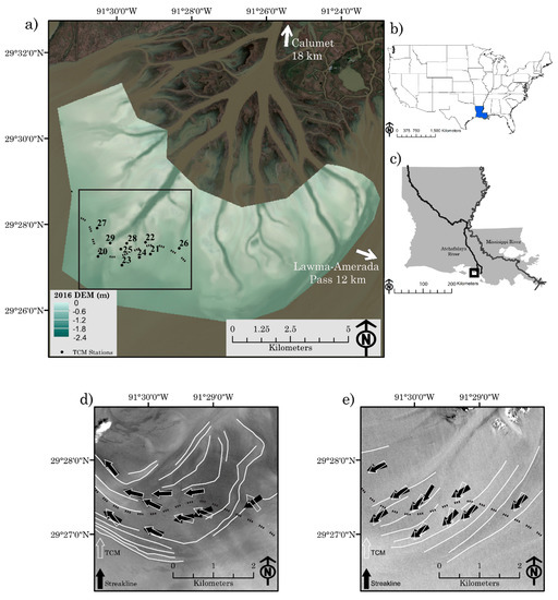 Figure 1a–c). The sheltered nature of the Atchafalaya Bay, in which the WLD is located, allows for the floating biofilms coming from the vegetated unchannelized regions to remain coherent for several km basinward of the delta, making it an ideal location to track streaklines. The in-situ flow direction data for this study were collected using 10 Lowell Instruments TCM-1 tilt current meters (TCMs) deployed from 21 March 2017 to 23 March 2018 on the WLD. The buoyant TCMs were fastened to an anchor using a short nylon rope and were deployed in water depths ranging from 1.0–2.4 m. The 0.76-m long instrument directly measures the flow direction in the decimeters above the bed, rather than at the surface where the biofilm streaklines exist. As the water flow inclines the TCM, the orientation is recorded from a three-axis accelerometer and a three-axis magnetometer. The instruments recorded the orientation at 16 Hz for 120 s, every six minutes. Subsequently, the measurements were time-averaged, and were processed using Lowell Instruments Domino software, which, through the application of calibration coefficients, transformed the data into speed and direction. The measurements presented here are the 120 s average measured closest to satellite image acquisition. The TCMs were deployed around the tip of Gadwall Pass (