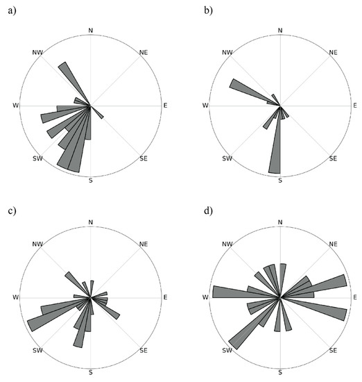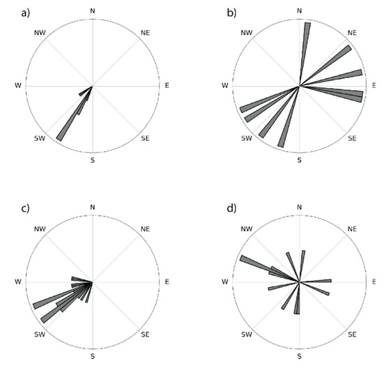 Figure 2a,d). The flow direction varied gradually at each TCM deployment, but the flow direction varied by a minimum of 86.4° (T29) and a maximum of 278.5° (T23) across the 19 Sentinel images (