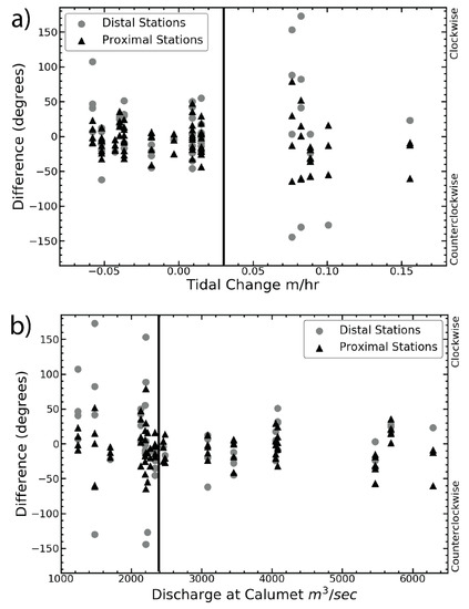 Figure 4a). The streakline measurements were relatively poorly behaved when the tide was rising at a rate greater than 0.07 m/hr (RMSE = 68.5°). When the tide was falling or rising at a rate less than 0.03 m/hr, the differences were relatively small (RMSE = 25.8°). The water discharge measured at Calumet also significantly affected the difference (