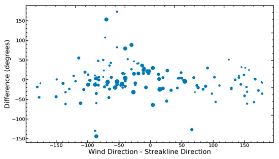 Figure 6). The data show that even under conditions where the wind direction was perpendicular to the streakline direction and of a significant wind speed, the streakline direction was not systematically influenced.