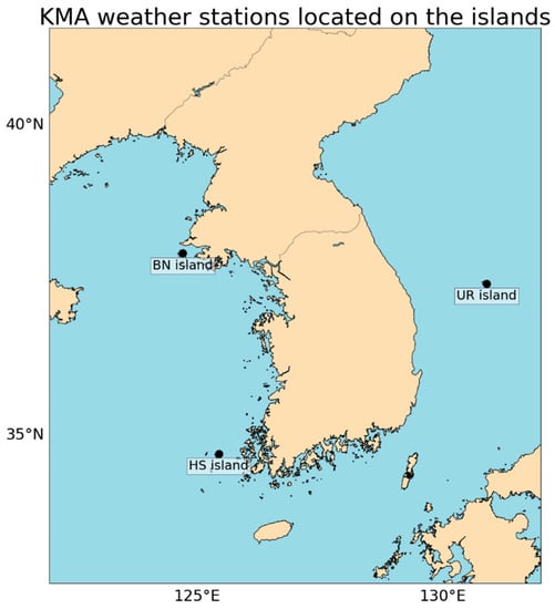 Locations and names of the Korean Meteorological Administration (KMA) weather stations on the islands (Baengnyeong (BN), Heuksan (HS) and Ulreung (UR)).