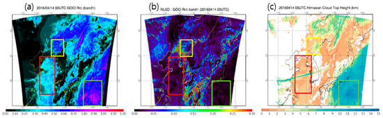 Input variables used for the marine fog detection algorithm: (a) GOCI Rrc, (b) normalized local standard deviation (NLSD) of GOCI Rrc and (c) Himawari-8 cloud top height (CLTH) for April 14, 2016. The red, yellow and green boxes indicate marine fog, low-level cloud and high-level cloud regions, respectively.