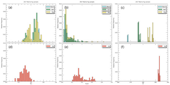 Histogram of the GOCI (a, d) , (b,e) NLSD and (c,f) Himawari-8 IR values of the marine fog samples. Relatively cold (a–c) and warm (d–f) months are displayed separately.