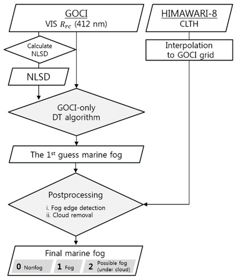 The developed MF detection algorithm (Figure 6) is designed to conduct two steps: (i) GOCI MF detection based on the DT approach and (ii) postprocessing for improving cloud removal and fog edge detection using Himawari-8 data, which will be explained in the following two subsections.