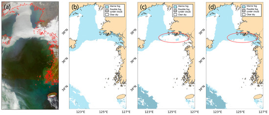 GOCI RGB image (a), the results of the marine fog detection algorithm before postprocessing (b), algorithm with postprocessing of cloud removal (c) and additional edge detection (d) using the Himawari-8 CLTH data.
