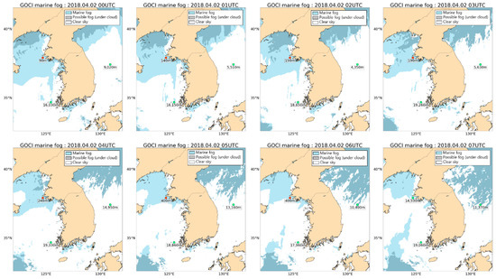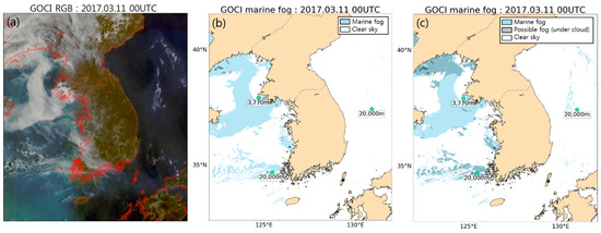 Figure 9 shows an example of MF detection, which shows that the FAR is reduced in the postprocessing step. On 11 March 2017, the GOCI DT algorithm shows that MF widely occurred across the northern part of the Yellow Sea (Figure 9b), and was rather scattered across the southern part of HS. BN remains just outside of the northern fog detection region, which was in good agreement with the visibility observations (3770 m). HS was located in the middle of the southern scattered fog system (Figure 9b) according to the GOCI-DT-based classification. However, it was changed to “2 (possible cloud)” through postprocessing (Figure 9c). Thus, the final result (e.g., clouds) near the island of HS corresponds well with the high visibility (20,000 m) observations. In summary, the 2017 validation contingency table and the comparison of several retrieval results in the two steps show that the combined use of GOCI and Himawari-8 data is advantageous to the satellite fog detection performance.