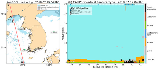 Another comparison of CALIOP overpass and MF results is shown in Figure 12a,b for 19 July 2018. Additionally, the MF region retrieved from the MF algorithm (Figure 12a) is consistent with the vertical profile (Figure 12b). In Figure 12b, the very low altitude of clouds (gray shading) along the B‒C line indicates the presence of fog. While only a few cases could be evaluated with CALIPSO, the method using VFM data was very useful to verify MF across a wide area where in situ observations are not available.