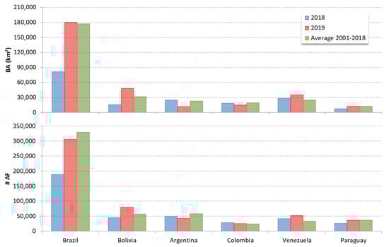 A similar trend was observed in the most affected countries. Brazil, for instance, had in 2019 a similar BA than the average of the 2001–2018 time-series (180,258 and 177,275 km2, respectively), but the BA was 2.2 times larger than the BA estimated for 2018 (81,881 km2). The relative impact of fires in the region was much worse in Bolivia than in Brazil. Bolivia tripled the BA of 2018 (48,187 versus 15,448 km2), and it also exceeded by 51% the average of the time series (31,819 km2). 2019 was also clearly worse than 2018 in Venezuela (24% more BAs, with 44% above time-series average), and in Paraguay (69% more BAs, but in this case very close to the average of the times series). Colombia and Argentina had less BA than in 2018 and this was also well below the average BA in the time series.