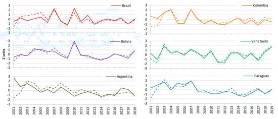 Country anomalies of BAs (solid line) and AFs (dotted line) for the 2001–2019 period (considering only from January to October).