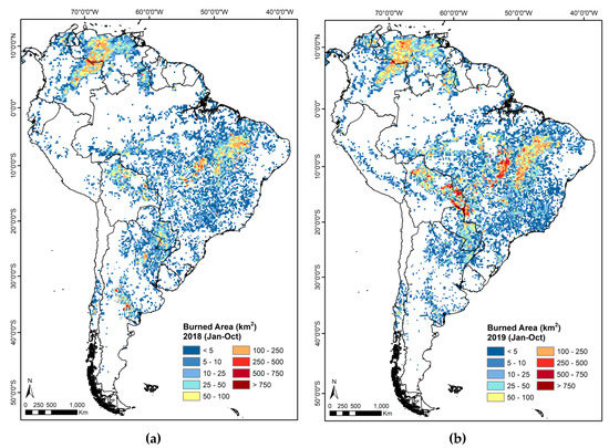 Spatial distribution of BAs in South America in 2018 (a) and 2019 (b).