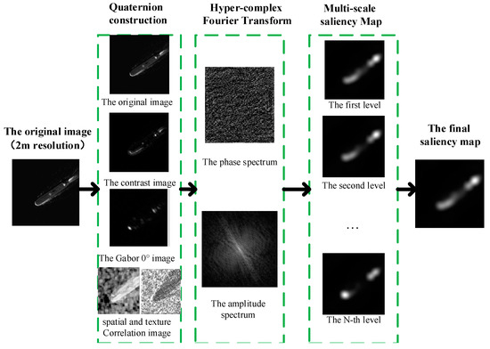 Aiming at these addressed problems, a novel saliency map detection method is proposed based on the improved PQFT algorithm, called the modified PQFT (MPQFT). The method improves the PQFT in two aspects: one regards how the quaternion is constructed for the panchromatic remote sensing image to obtain uniform and complete target areas; the other regards how the saliency map is generated to ensure that differently sized targets can be detected at the same time. As shown in Figure 2, the proposed algorithm in the process of the MPQFT mainly consists of four steps: constructing the quaternion using different feature maps, carrying out hyper-complex Fourier transform to the quaternion, calculating multi-scale saliency maps, and generating the best saliency map. The process of the MPQFT is shown in Figure 2.