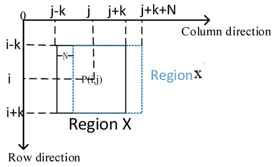 where and are the square regions centered on the pixel and , respectively. I and j are the row and column coordinates of the image. N is set to 5 in this paper. and are areas represented by the black and blue borders in Figure 4. The sizes of them are both k × k pixels. and are standard deviations of the corresponding areas. and are the mean value of the region and , respectively. represents the dot product of the gray value in the corresponding position of the two regions, and the size of is k × k pixels. is the mean value of the .