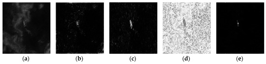It is not difficult to find through a large number of experiments that, for panchromatic images, the performance of the frequency domain method is better than the spatial domain method. The spatial domain method cannot suppress the clutter interference and is greatly affected by strong waves and clouds. The SR and PQFT show no significant differences in performance. For the second image in Figure 12c,d, the ship target is completely submerged into the background and cannot be distinguished. The performance of the method found in [12] is better than other frequency domain algorithms, but the detected target area is incomplete, and the target easily melts into the background, as shown in the third, fourth, and fifth images in Figure 12f. The method from [12] only uses gray information, so ROIs cannot be accurately detected. Compared with other algorithms, the method of the saliency map extraction proposed in this paper obtained a better effect, despite a low contrast or a complex background. The detection result was more complete and clearer. Moreover, the brightness value distribution of the target area was uniform, which also helps to detect completed targets in the binary process. This will prevent to some extent incomplete target slices caused by too much brightness or too much darkness.