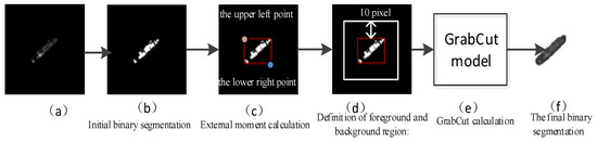 After the detection of saliency maps, saliency regions are enhanced, and the background is suppressed. In order to locate positions of candidate targets in the image, binary segmentation is needed. Furthermore, these areas include ships and false alarms. We can eliminate some simple false alarms by characteristic parameters and obtain ROI candidates. In order to extract the characteristic parameters of saliency regions, such as length and width, it is necessary to obtain binary images of saliency maps. Therefore, an adaptive segmentation based on the Otsu method and GrabCut [27,28] was executed to extract candidate target regions.