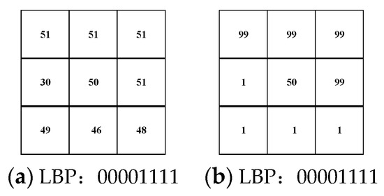 The LBP operator is gray rotation-invariant [29]. However, the LBP method only considers the size relationship between the central and neighboring pixel, with no contrast relationship. Therefore, different contrast distributions have the same LBP value as shown in Figure 8.