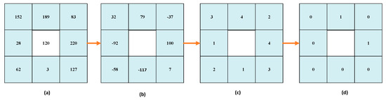 One example of the MLBP description process is given in Figure 9. The value of the central pixel is 120, N = 8, L= 4, and the size of the neighbor is 8 pixels, displayed in blue in Figure 9. The surrounding pixel values are compared with the central value to obtain the contrast map as shown in Figure 9b. The level of each neighbor pixel is calculated according to Equation (22) as shown in Figure 9c. The initial binary description of this area is 00000101, according to Equation (23), and the number of exchanges between 0 and 1 is 4. The rotation invariance binary descriptor of this area is 9.
