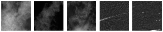 The process of the quaternion construction, and the result of the proposed saliency model. (a) The original image covered by thick cloud. (b) The contrast map generated by Equation (11). (c) The Gabor transform map generated by Equation (12). (d) The blend feature map combining spatial correlation with texture feature generated by Equations (13)–(16). (e) The final saliency map based on Equation (20).