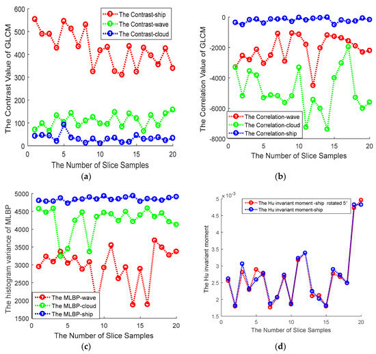 The Hu moment is a highly concentrated image feature with translation, rotation, and scale invariance. The first two moments M1 and M2 of Hu were used as a set of parameters to describe the characteristics of ships. We rotate the 20 ships by 5°, and the second moment of Hu changes little after the rotation, as shown (d) in Figure 11 From the above analysis, it can be seen that the feature description selected in this paper is strong and robust.