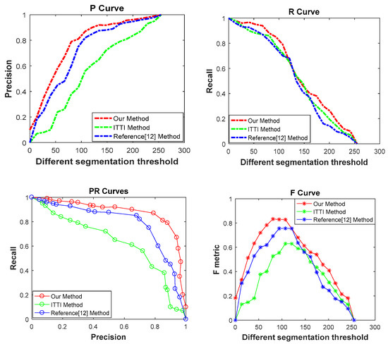 We selected the PR curve and the comprehensive evaluation index F measure to evaluate the accuracy of various algorithms. Ground-truth images (manual marking) and binary images of saliency maps were recorded as G and M. In the PR curve, P and R refer to the precision and recall of the methods, respectively. Their calculation formulas are as follows:
