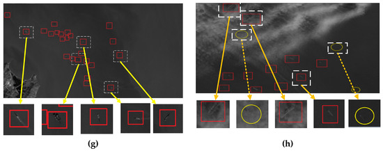 Detection results of images from the satellites ZY-3 and GY-2. (a) Detection results of cloud and wave coexistence. (b) Detection results of thick cloud interference. (c) Detection results of mist interference. (d) Detection results of strong wave interferences. (e) Detection results of a calm sea surface. (f) Detection results of very low contrast. (g) Detection results of middle-size ships with wakes and wave interference. (h) Detection results with thick cloud occlusion.