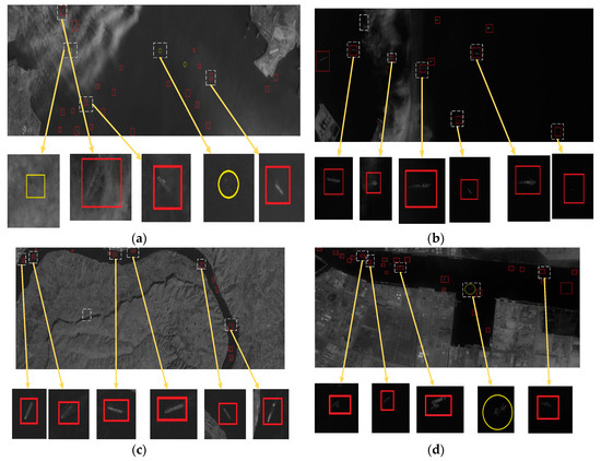The proposed method was implemented in C++ with Intel (R) Core (TM) i7-4770K CPU at 3.40 GHz and 64.0 GB RAM. The objective evaluation indices of the detection results are listed in Table 1. Because these images are so large in size that they will be compressed in this paper, we provided some local parts of the original images, as shown in Figure 14 and Figure 15. Red borders indicate the ship targets we detected, and the yellow border areas indicate ships we missed with our method. In some cases, we lost some targets, as shown in of Figure 15a,d. In Figure 15a, one ship is almost completely obscured by clouds, making it difficult to locate the target, and another one is lost because the contrast of the ship and the background is too low, making it difficult to distinguish by the human eye. In Figure 15d, more than five ships are connected and docked, making it different from the conventional training model in terms of the shape and area; therefore, the targets were not recognized.