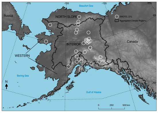 Alaska spans a large area, approximately 20° of latitude and 50° of longitude, encompassing the North Pacific, Arctic Boreal, and Arctic Ocean regions of the extratropical (>50°N) Northern Hemisphere. Within this region, multiple gradients influence the climate, including latitude, distance from large water bodies, the relative thermal mass and circulation of coastal waters, the location and orientation of major mountain ranges, and elevation. With over 10,000 km of coastline, the region is bounded by the Pacific Ocean to the south and the shallower, seasonally ice-covered Bering, Chukchi and Beaufort seas to the west and north that provide sources of moisture and thermal gradients that drive seasonal weather. This high latitude region also plays an important role in the earth’s energy, water and carbon cycles, and is highly vulnerable to recent climate warming [3,40]. Much of the region is snow covered for 6 to 9 months of each year; thus snow is an integral component of the ecosystem and a phase change from snow to rain has potentially profound implications for ecosystem structure and function. Thirteen climate divisions have been described for the state of Alaska [41], which we aggregated into three broader regions for the spatial SO analysis, including Interior, Western and North Slope domains (Figure 1). These domains reflect Alaska’s major climatic regimes representing moderate Pacific maritime, cold-dry boreal interior, and polar arctic northwest coast and North Slope climate zones. The spatial extent of the PMW-derived SO record from this study includes Alaska, the Russian Far East, and northwest Canada (See Supplementary materials); however, our comparative analysis covers a smaller domain defined by the Landsat snow persistence product [31].