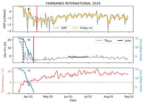 Example Special Sensor Microwave Imager (SSM/I) gradient ratio polarization (GRP) time-series over Fairbanks International Airport (64°48′59″N, 147°51′49″W) for the 2016 water year: (a) daily GRP (grey) and 4-day running mean (orange); (b) Tb difference (grey) with average Tb difference during June denoted by the horizontal black line. In both (a) and (b), the black vertical dashed line shows beginning of melt and the vertical red bars represent the calculated SO date for each method. (c) Daily average air temperature (red) and snow depth (blue).