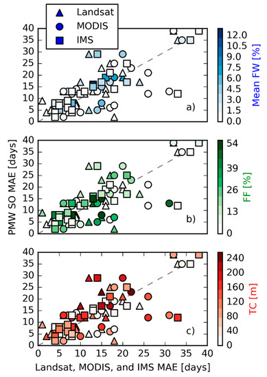 There were no obvious impacts from the selected landscape heterogeneity factors on the SO MAE performance over the sparse SNOTEL locations (Figure 4). However, we compared the surface characteristics (FW, FF, TC) at each SNOTEL site location across the different SO datasets where the MAE was above or below a 14-day precision threshold. The results indicate that the PMW SO performance was optimal (MAE < 14 days) for locations where the mean FW level was low (0.94 %), and degraded (>14 days) where the FW level was larger (4.3 %). These results are generally consistent with the expected strong PMW sensitivity to surface water [56]. However, the MODIS SO record also showed a marked decrease in MAE performance from low (0.78 %) to high (3.47%) FW levels, while the Landsat and IMS records showed only marginal SO sensitivity to FW (Table A2). The PMW SO performance was also optimal for SNOTEL locations where terrain complexity (TC) was relatively low (mean TC = 108m), and degraded at higher TC levels (112 m). The IMS and MODIS SO records also showed similar decreases in MAE performance in more complex terrain and areas of moderate FF.