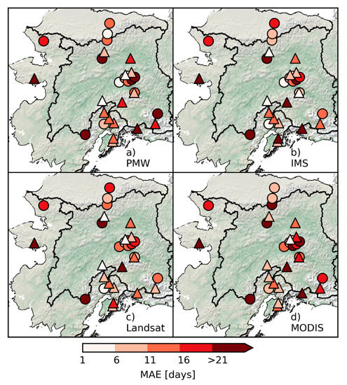 The spatial distribution of SNOTEL validation stations and their associated MAE values for PMW (a), IMS (b), Landsat (c), and MODIS (d) derived SO records. Circles indicate stations with less than ten annual SO observations for the study period and triangles indicate SNOTEL stations with SO records greater than 10 years.