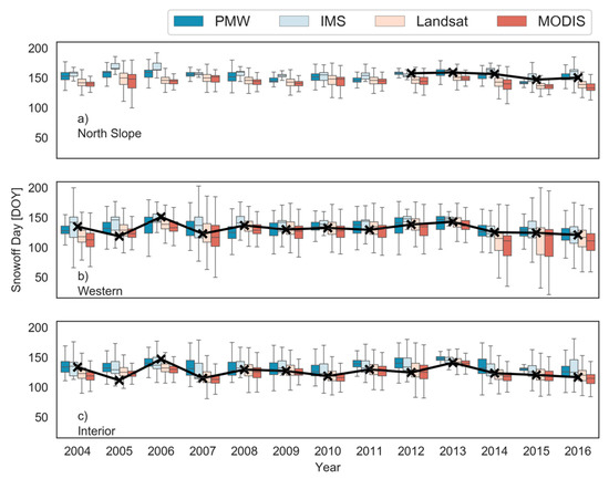 The PMW SO results were compared with the other geospatial SO benchmarks and the spatially aggregated SNOTEL SO observations within three major Alaska climate zones, including North Slope, Western, and Interior regions; the resulting annual distributions are plotted for each sub-region over the 2004 to 2016 study period (Figure 6). Overall, the PMW SO results showed similar spatial distributions and interannual variability in relation to the other geospatial SO records and available SNOTEL observations. However, the PMW and IMS results were generally more similar with each other and with the SNOTEL observations, while the Landsat and MODIS SO records showed a relatively early SO bias. The SNOTEL SO observations indicated early SO conditions in 2005 over the Alaska interior region consistent with an anomolous warm spring [61]; however, the geospatial SO records indicated more normal conditions in this region relative to the other years of record.