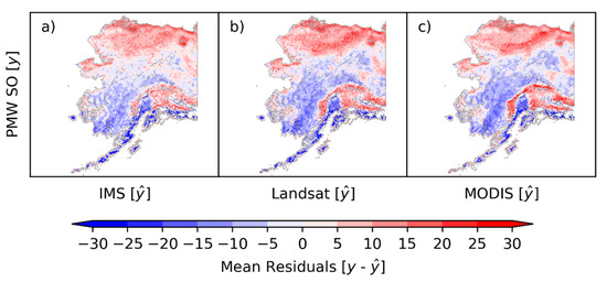 In addition to validating the PMW SO dates against SNOTEL measurements, we also compare the PMW SO with other satellite-derived Alaskan SO dates. The comparisons are quantified as residuals (days) showing the location and magnitude of PMW SO occurring earlier or later relative to the other SO records.