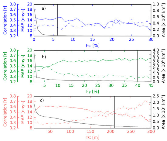 Mean absolute error (MAE) (dashed line) and correlation (solid line) between PMW SO and the other geospatial benchmark datasets over the Alaska domain, aggregated by terrain features, FW (a), FF (b), and TC (c). The grey line shows the area of the domain (Y2-axis) represented by each terrain factor (X-axis), while the black vertical lines indicate where 90% of the total area is represented. The colored dashed and solid lines denote respective MAE and correlations for each landscape factor. *Note Area y-axes represent different scales between panels.