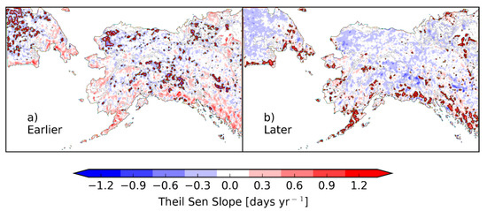 We performed an analysis to determine the potential trends in annual SO timing over Alaska as defined from the long-term (1988–2016) PMW satellite record. The MKT results show both earlier and later SO trends across the Alaska domain (Figure 9). Approximately 51% and 42% of the domain showed trends toward, respective earlier and later SO timing, with 18% of these area trends significant at the 90% level. The later SO trends predominantly occur in the Russia Far East, North Slope, and Interior regions, while the earlier SO trends mainly occur near coastal margins. The relatively low level of significant trend areas is attributed to the large characteristic climate variability in Alaska relative to the more subtle environmental trends represented within the 29-year satellite record. For areas that are significant, the mean earlier trend was −0.39 days yr−1 and ranged between −1.31 and −0.11 days yr−1. Likewise, the mean later trend was 0.55 days yr−1 and ranged between 0.14 and 0.55 days yr−1.
