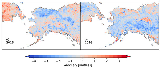 Water years 2015 and 2016 were two of the warmest years of the 29-year satellite record and are analogous to the projected future increase in mean temperatures across Alaska [62]. We evaluated the annual SO response during these anomalous warm years as a proxy for understanding future SO behavior in a warmer climate. The pixel-wise SO anomalies were derived for water years 2015 and 2016 to quantify their annual departures from average conditions defined from the 29-year PMW record (Figure 10). The respective average surface air temperatures from January to April were 3 °C and 6 °C above-normal over the study domain for 2015 and 2016 [62].