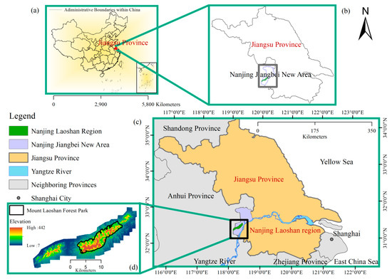 Overview of the study area: locations of (a) Jiangsu Province within China; (b) the Nanjing Jiangbei New Area (NJNA) within Jiangsu Province; and (c,d) the elevation map of the study area (Nanjing Laoshan Region (NLR) including Mount Laoshan Forest Park (MLFP)) near the Yangtze River within NJNA.