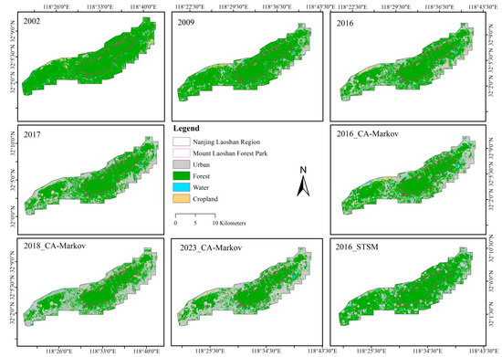 The total forest area estimated from the SPOT-based land cover map in 2016 was 49.22 km2 for the MLFP (Figure 3), which was much lower than the 64 km2 recorded by the statistical data. The CA-Markov algorithm simulated the total forest park areas of 2016 and 2018 as 48.63 km2 and 48.45 km2, respectively; that of 2018 based on the CA-Markov algorithm was close to the land use planning data (46.55 km2, 91.9% of the total area; www.pukou.gov.cn).