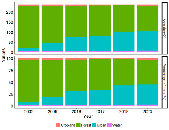 We summarized the total area and the percentage of area for each land cover type in our current and predicted land cover maps for multiple years (Figure 5). In general, we observed a gradually decreasing trend of forest area, while an increasing trend of urban, cropland, and water area. Specifically, we estimated a potential decrease of total forest area from 209.4 km2 to 123.9 km2 between 2002 and 2023 (40.8% decrease, about 52.3–88.4% of the total area). While we predicted about an 82.8% increase of the total urban area from 17.23 to 99.92 km2 between 2002 and 2023 (about 7.3–42.2% of the total area). The areas of cropland and water were relatively stable from 2002 to 2023, with slight increases of 8.7% and 35.2%, respectively.