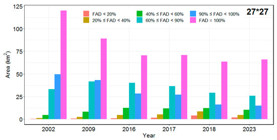 Five moving window neighborhood sizes were chosen to calculate and map FAD-based forest fragmentation (Figure S5). The change in forest fragmentation was not very obvious after 2002 after reviewing all of the window sizes; however, the change trend of the low and highly fragmented forest was consistent (Figure 8 and Figure S5). The area of forest with limited fragmentation had a general decreasing trend since 2002, with a small increase from 2018 to 2023. The area of highly fragmented forest remained relatively stable with no obvious dynamic change; only a slight difference was observed in and after 2018, especially in 2018. The forest area with a medium level of fragmentation initially increased and then decreased over time. The area of forest pixels belonging to the forests with a low level of fragmentation was at least 40 times greater than that of highly fragmented forest.