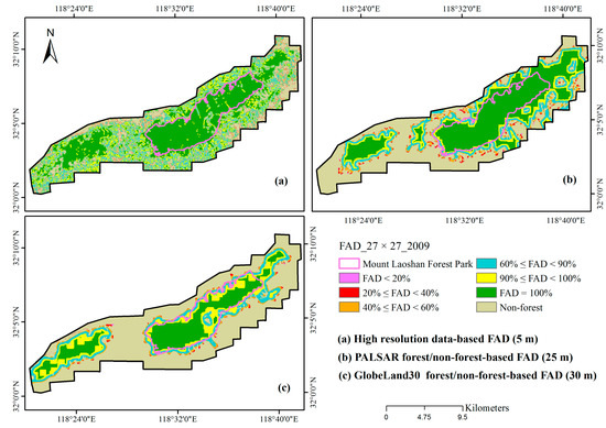 Forest fragmentation pattern measurements by forest area density (FAD) values from multi-source data including high resolution RapidEye data (a), PALSAR forest/non-forest (b), and China’s GlobeLand30 forest/non-forest (c) for the neighborhood size of 27 × 27 over each forest pixel in 2009.