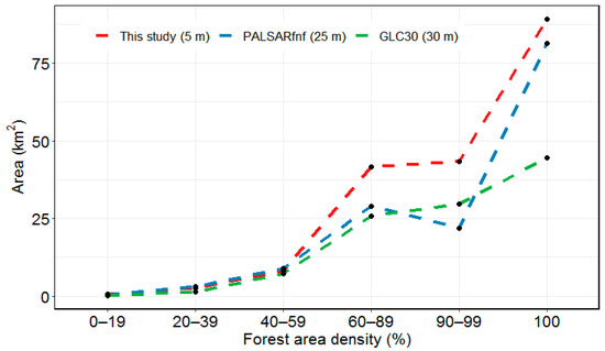 Moreover, this discussion uses the FAD classes generated with the three data sources and defined in Table 3. Figure 11 shows that an overall increasing trend for the area of forest fragmentation from rare forest (0–19%, <1 km2) to intact forest (100%), particularly with the high resolution data. The substantial amounts of rare forest (0–19%), dominant forest (60–89%), interior forest (90–99%), and intact forest (100%) characterized by the high resolution land cover data were identified, especially for dominant and interior forest, which were approximately twice greater than the data from medium resolution PALSAR and Landsat-based land cover data (Figure 11). Naturally but unexpectedly, the amount of intact forest identified by the GLC30 (44.5 km2) was less than half of that found in this study (89.19 km2) accompanied by the area of 81.31 km2 found using the PALSAR data. Overall, the estimates of the area of dominant, interior, and intact forest (particularly the first two) by the high-resolution data exceeded their medium resolution counterparts.
