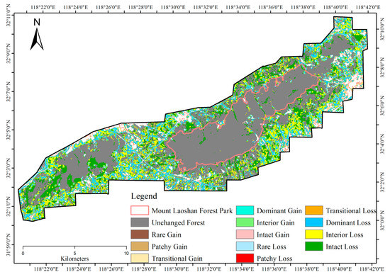 China has several types of protected forests and other types of landscapes, such as the National New Areas and National Forest Parks of China [45,46]. Established in 2015, the Nanjing Jiangbei New Area (NJNA), Jiangsu Province, China is being developed to become China’s important scientific and technological innovation base and an advanced industrial base with an ecologically sound and livable civic environment (www.najing.gov.cn). How to maintain a balance between the forest interior and the forest itself in the Nanjing Laoshan Region (NLR) of Jiangbei New Area, eastern China, is a critical issue that needs to be addressed to allow forest managers and policy-makers to create effective strategies designed to manage urban forests sustainably [13,15,25,47]. This study aims to map forest cover change and fragmentation patterns with high-resolution remotely sensed data for the Nanjing Laoshan Region at a regional level during 2002–2023. Specifically, we focus on: (1) mapping recent land cover based on high resolution imagery and simulating future land cover change by using two landscape predictive models; (2) comparing FAD-based fragmentation patterns derived from medium or high resolution data; and (3) quantifying the spatial pattern of forest loss and gain based on the dynamics of forest interior and intact areas.
