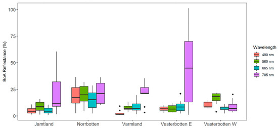 Reflectance spectra of 46 lakes in the five Swedish regions in this study. Reflectance values are bottom-of-atmosphere reflectance (BoA) after atmospheric correction. The wavelengths signify the central value in each band, as shown in Table 3.