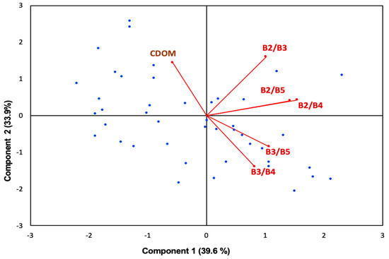Partial least squares regression (PLSR) model with different band ratios variables as predictors (after atmospheric correction) and coloured dissolved organic matter (CDOM) as a response variable, based on data from 46 lakes in five different regions in Sweden. Vectors show loadings (PLS weights), scaled by a factor of 2 to fit the biplot with site scores. The site scores are shown in blue filled circles.