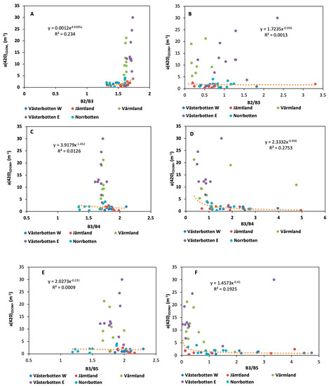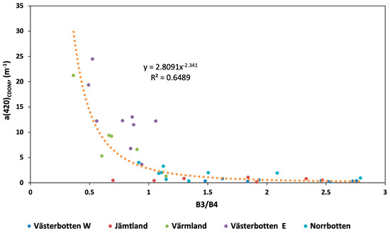 Power relationship between the CDOM absorption coefficient at 420 nm and the ratio of band 3 to band 4, calculated from Sentinel-2A data after the outliers were removed (n = 5), based on the results from 41 Swedish lakes.