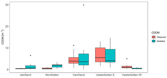 Modeled and in situ, a(420)CDOM exhibited similar patterns and ranges across the study regions (Figure 6). Västerbotten E and Värmland had the highest a(420)CDOM concentrations and the highest variability. On the other hand, Jämtland and Norrbotten had the lowest variability in remotely sensed a(420)CDOM and clearer water compared with that of the other regions.