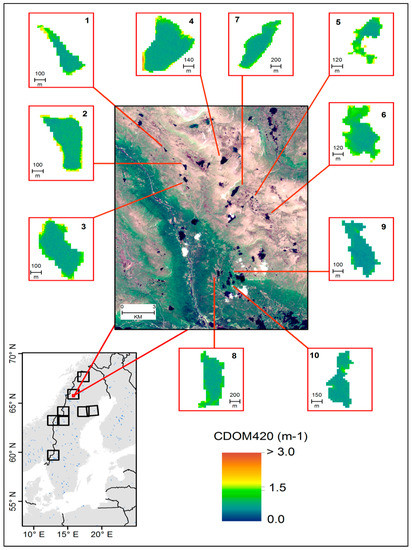 CDOM spatial gradient in lakes 1 to 10 covering Västerbotten W (33WWP). The base image in the central panel is Sentinel-2A true color composite taken on 21 July 2016. Note that Västerbotten W had some of the lowest in situ CDOM values (see Table 4 and Figure 5), which explains the low maximum in this figure.