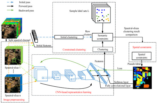 As illustrated in Figure 1, our method is a recurrent framework which consists of four modules: image preprocessing, CNN-based representation learning, constrained clustering and spatial constraints. A simple description of Figure 1: (1) Preprocessing of the image, the hyperspectral image is divided into spectral-slices according to the number of spectral channels; (2) CNN (network structure based on LeNet [] modification) performs spectral-spatial feature extraction for each spectral-slice separately; (3) The feature set extracted from each spectral-slice is separately constrained clustering to obtain the clustering results of all spectral-slices; (4) Similar to finding intersections between sets, the clustering results of each spectral-slice are compared. The results in each spectral-slice have the same semantic class as the HSIc result of the constrained clustering. (5) Adding a space constraint to the HSIc result to obtain a pseudo labels. (6) The generated pseudo labels and input data are input to the CNN for the next round of training. All the details are as follows.