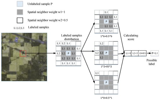 As shown in Figure 3, we assume that there are three types of labeled samples , , and in the square field centered on the sample point P, and spaces indicate unlabeled samples. We count the three types of labeled samples with different weights. The formula for calculating the i-th score is as follows: