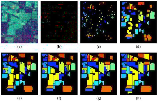 Among them, Figure 7a is the Indian Pines data, Figure 7b is the selected small number of labeled sample sets, and Figure 7c–g are the algorithm iterations to the first, third, fifth, seventh, ninth rounds of output. And the classification accuracy () of these iterations of the algorithm is shown in Table 4. Figure 7h is the ground truth of the Indian Pines data set. The algorithm stops when iterating to the 11th round, with a final classification accuracy () of 87.35%.